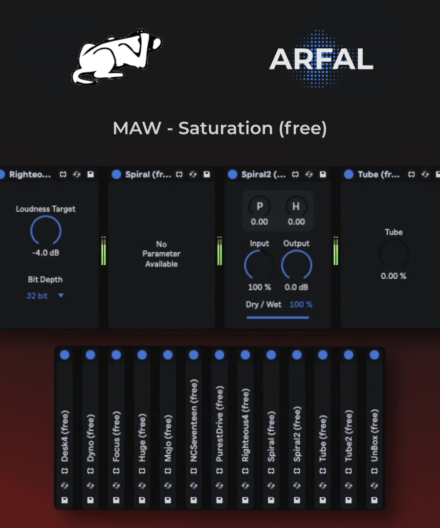 Inside this folder you’ll find a package ARFAL - MAW -Saturation. This package permits to integrate "MAW - Saturation" in the “Audio Effects” section , in the “Drive & Color” folder. This is experimental so PLEASE follow carefully the Installation video and install at your own risk !
